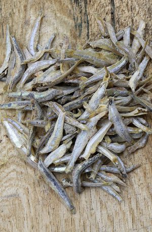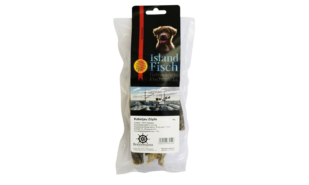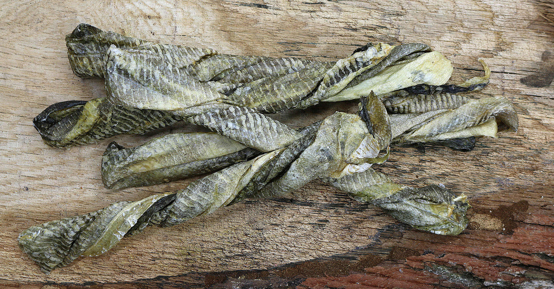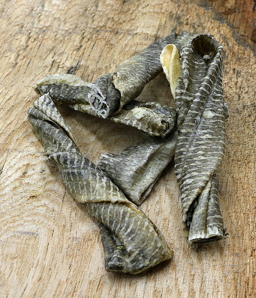 | Aussehen | getrocknete Fischhaut, gedreht, geschnitten |