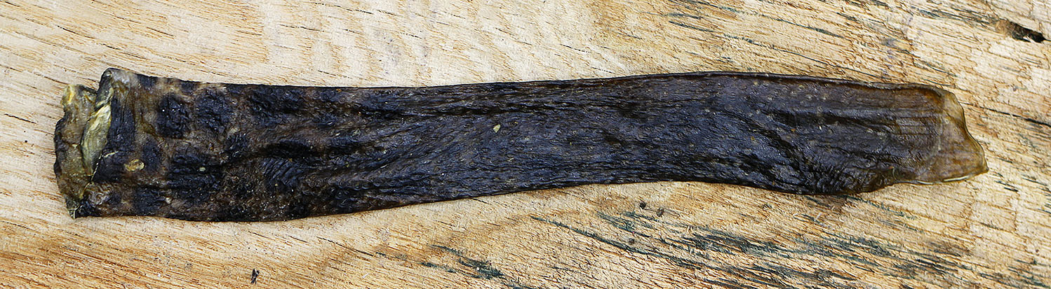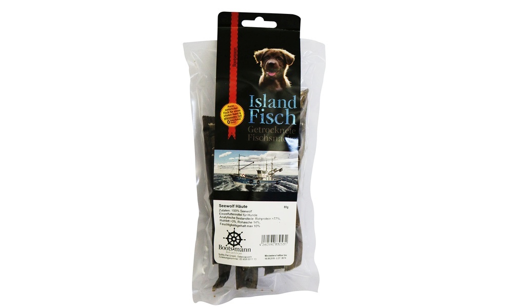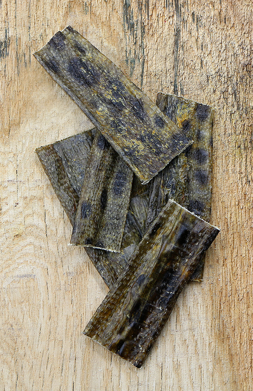 | Aussehen | getrocknete Fischhaut, geschichtet, geschnitten |